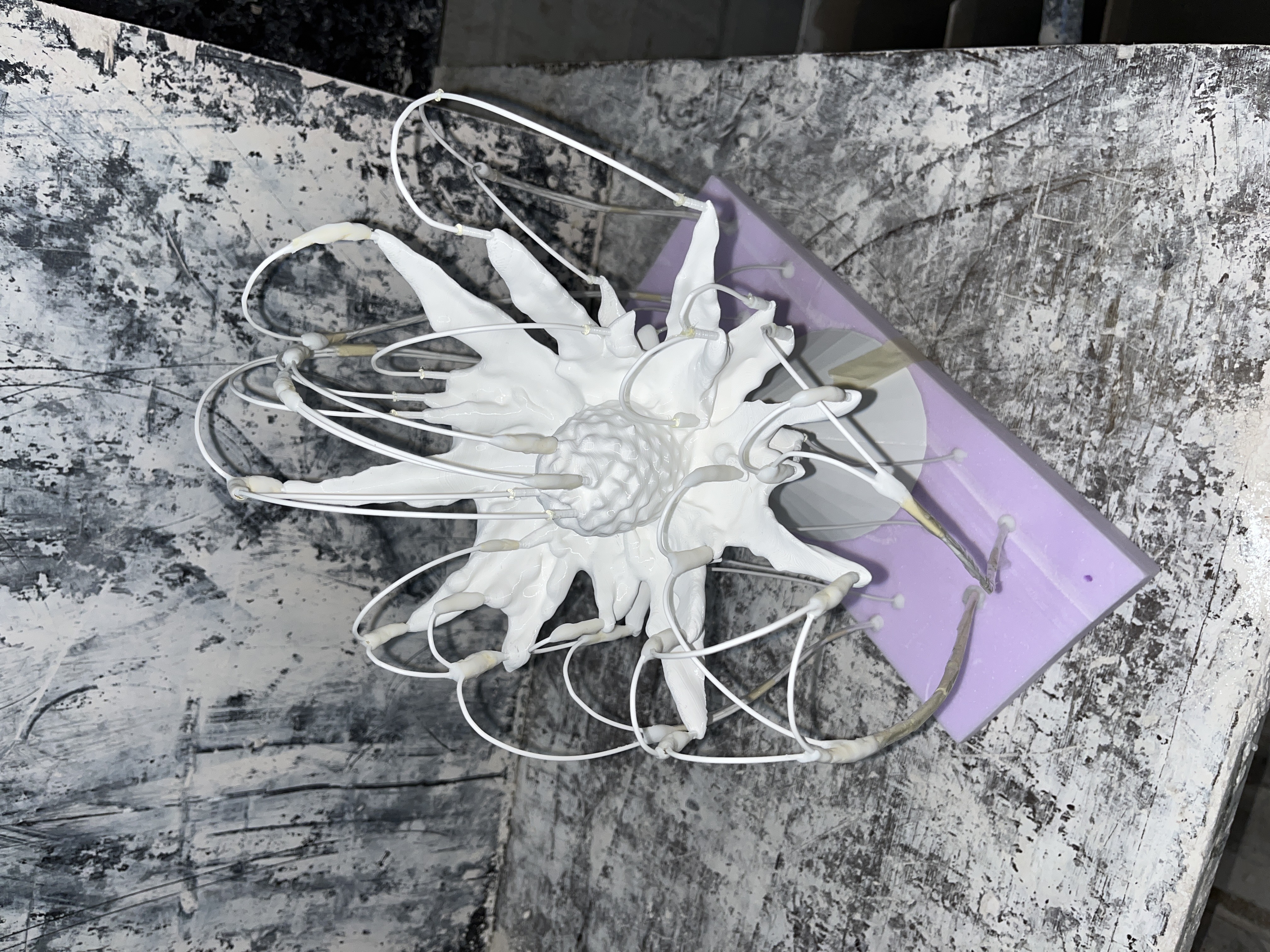 Mikaela Steby Stenfalks tolkning av Martornen liknar närmast ett skelett, något som är på väg att smälta, förvrängas och försvinna, som ett kusligt eko av vår tids artutdöd. Med tiden sätter naturen sina spår och dammens vatten färgar den benvita skulpturen, en stillsam förändring som speglar växtens sårbara beroende av sin omgivning. Erik Öbergs utgångspunkt återfinns i Ostronörtens sista, extatiska blomning med blå klockor utan koppling till ett rotsystem. Växten bärs upp av en kirurgisk Ilizarov-ställning i rostfritt stål — ett brutalt och smärtsamt men också nödvändigt stöd som speglar människans dubbla roll som hot och beskyddare. Sammantaget är verken poetiska skildringar av fragilitet, skuld, hopp och vårt ansvar inför det som riskerar att gå förlorat.