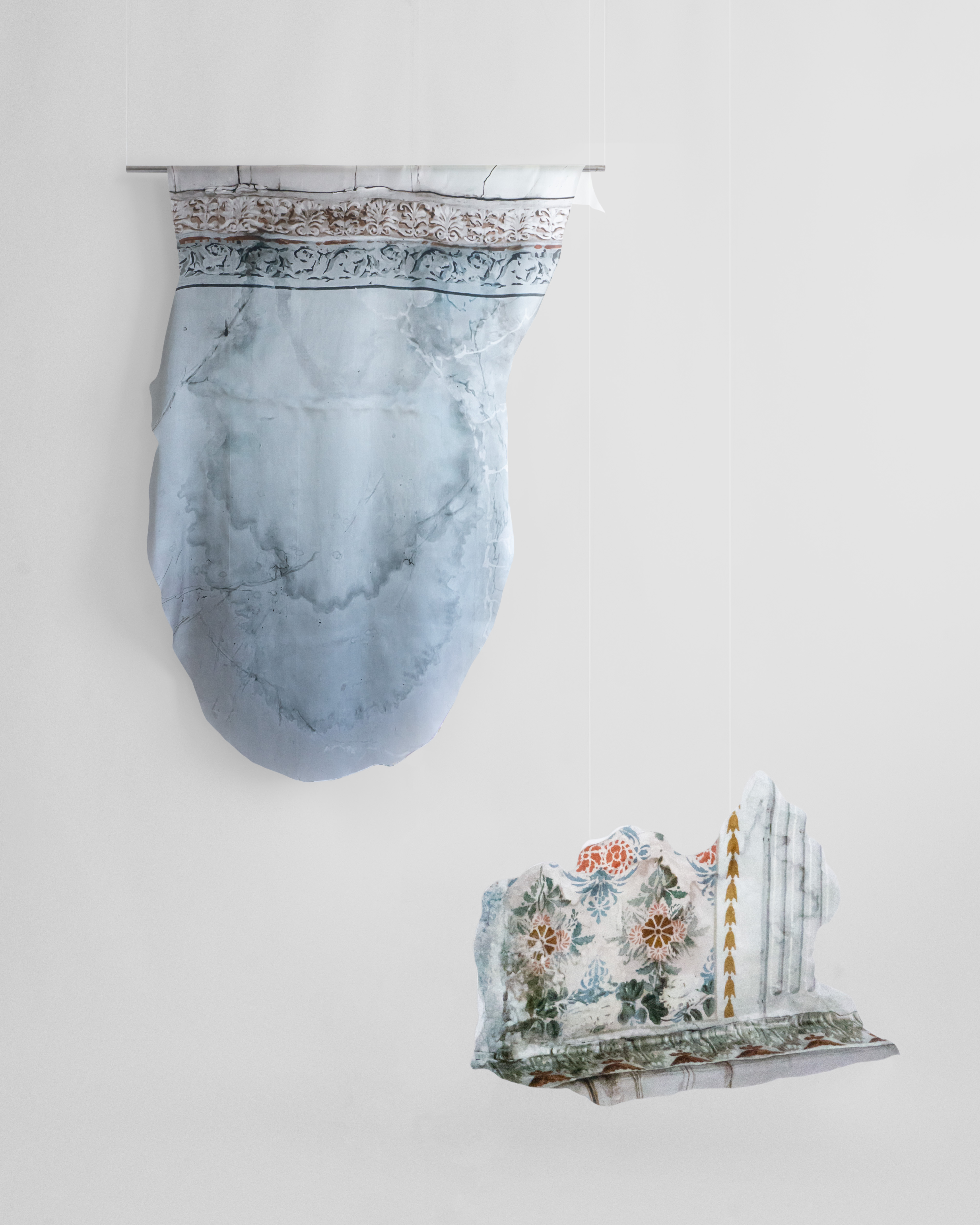 In the World Heritage Site of the Decorated Farmhouses of Hälsingland, water roses grow with each passing year. Moisture from outside creeps into the houses and out through the hand-painted walls. In the marbling of the linen and cardboard wallpaper, the rippling edges of the water roses flow out and seem almost contrived in the already organic pattern. The water-based paints run like raindrops in the landscape paintings on the wooden panels. In the flower-covered stencil paintings spreads a new kind of flower.